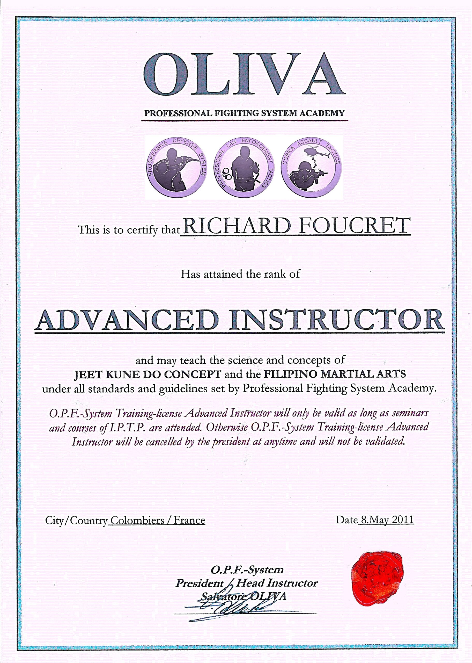 2011 – BEZIERS : ADVANCED INSTRUCTEUR « Certifié » de JEET-KUNE-DO/O.PFS. sous Salvatore OLIVA.