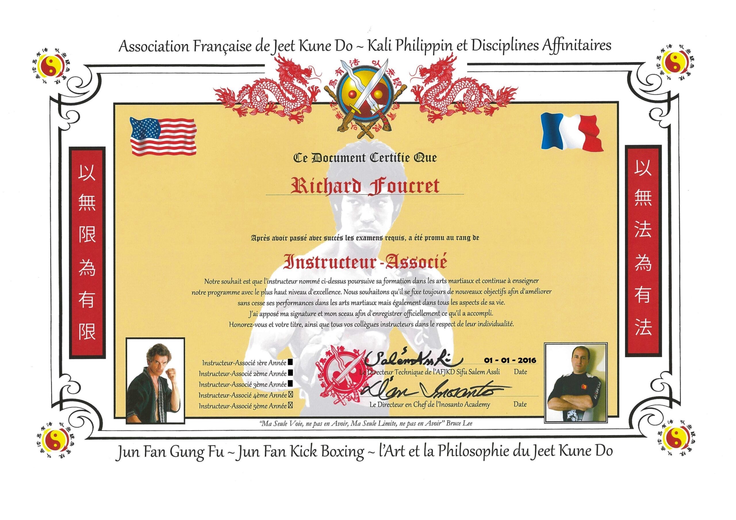 2015 – INSTRUCTEUR « Certifié » de JEET-KUNE-DO s/s le Full Salem ASSLI et susvisé par Dan INOSANTO.